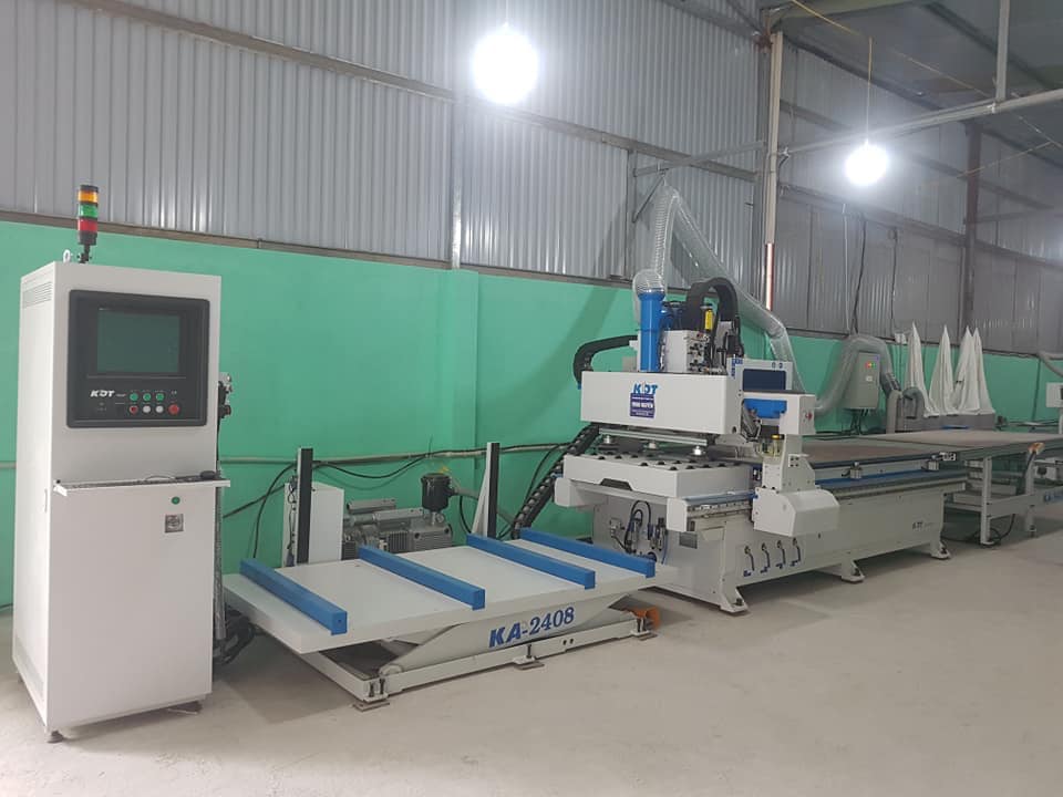 Đầu tiên, 1 chiếc máy CNC thay dao tự động - gia công trung tâm sẽ là công cụ đắc lực để cắt theo từng thiết kế sẵn trên phần mềm tối ưu hóa Polypoard